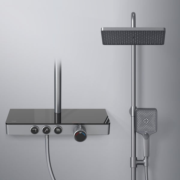 Die 30 × 20 cm große Regendusche aus Edelstahl erzeugt einen gleichmäßigen, großflächigen Wasserfluss, der den gesamten Körper verwöhnt. Die ergonomische Handbrause lässt sich mit einer Hand bedienen und ist auch für Menschen mit eingeschränkter Mobilität geeignet. Drei separate Funktionstasten ermöglichen eine klare, intuitive Auswahl zwischen Regendusche, Handbrause und Armatur. - Praktischer 2-in-1-Unterauslauf mit Ablage
