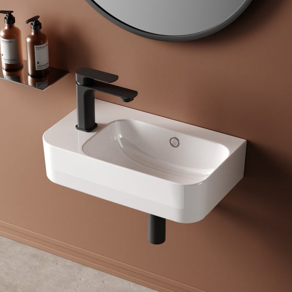 EMKE Eck-Waschtisch 45x26,5 cm mit Ablagefläche Wandwaschbecken rechts Hahnloch Glänzend Weiß