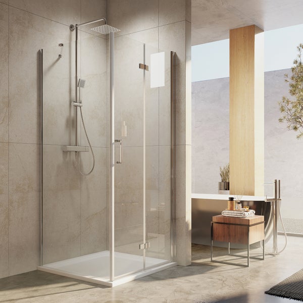 EMKE Eckeinstieg mit Drehfalttür Bodengleich 120x80 cm, 195 cm hoch, Falttür mit Seitenwand, Sicherheitsglas, Profil Chrom
