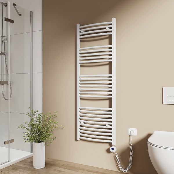 EMKE Elektrischer Badheizkörper 140x50 cm Gebogen 600 W Thermostat Timer Handtuchwärmer Glänzend Weiß