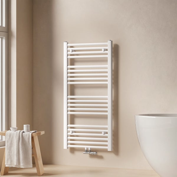 EMKE Handtuchheizkörper 100x50 cm, Handtuchwärmer mit Mittelanschluss, 427 W wasserführend, Rundrohr-Design, Glänzend Weiß
