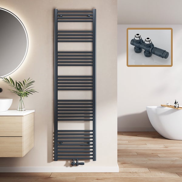 - Lieferumfang: 1x Handtuchheizkörper (Anthrazit Matt), 1x Thermostatventil (Anthrazit Matt), 1x Montagezubehör, 1x Installationsanleitung