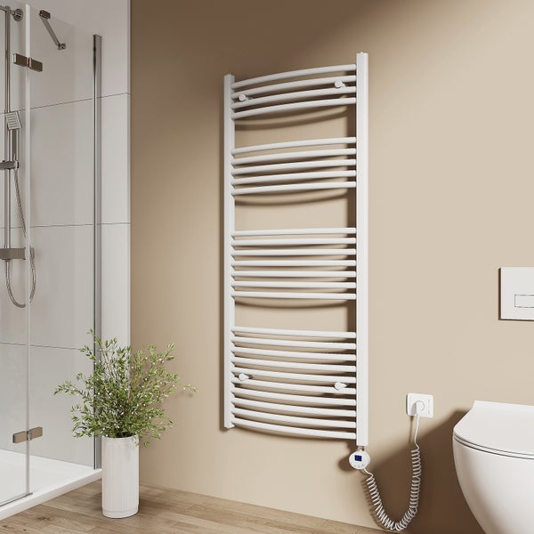 EMKE Handtuchheizkörper elektrisch mit Heizstab 140x60 cm, Gebogener Handtuchwärmer 600 W, Touch-Display, Stahl, Glänzend Weiß