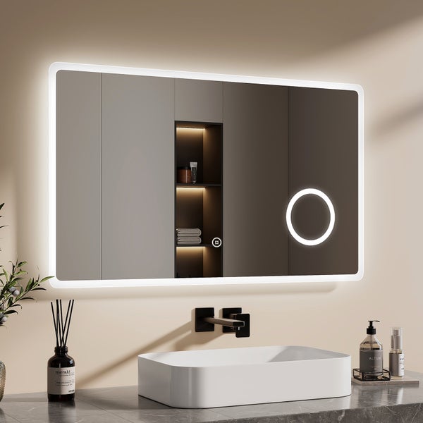 EMKE LED Badspiegel 100x60 cm, dimmbare Lichtspiegel-Beleuchtung, Kaltweiß, Touchsensor, 3x Kosmetikspiegel