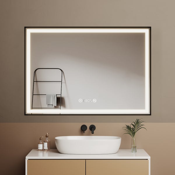 EMKE LED Badspiegel 100x70 cm Neutralweiß Rahmenspiegel mit Antibeschlag Touchsensor LCD-Uhr Schwarz
