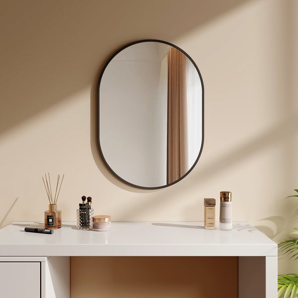EMKE Wandspiegel 50x70 cm Oval, HD, rostfrei, schwarzer Rahmen, horizontal & vertikal montierbar