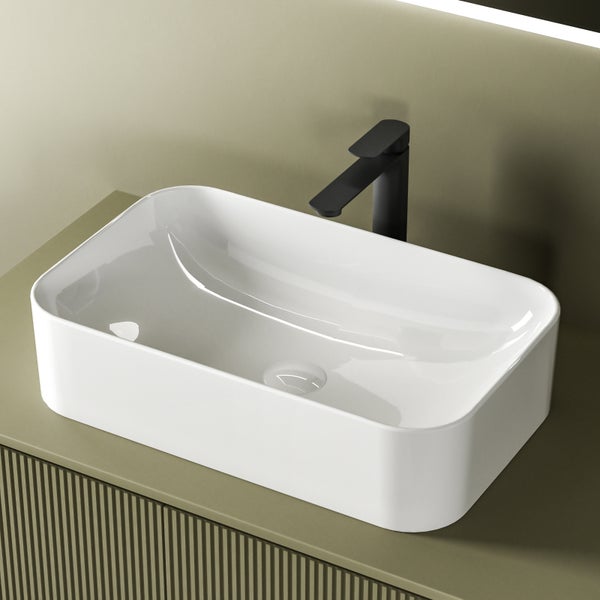 EMKE Waschbecken 61x38 cm Waschschale Aufsatz R-Ecken Keramik-Waschtisch Glänzend Weiß