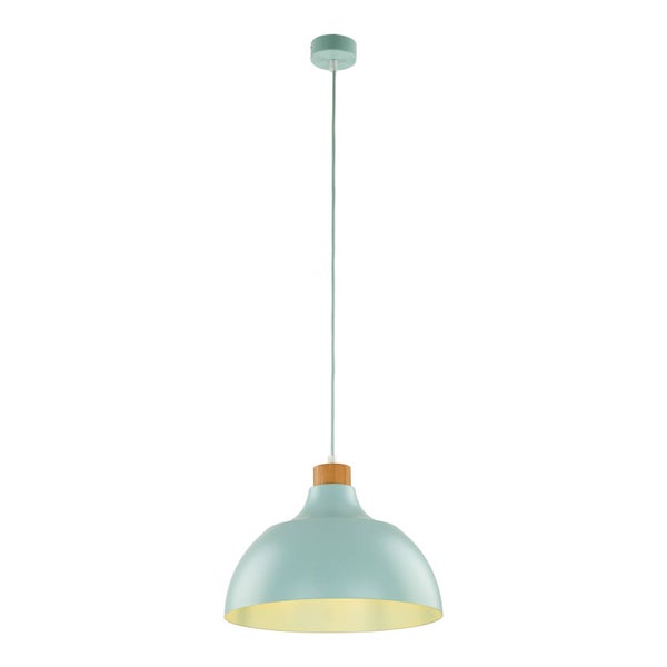 Die Kombination von runder, harmonischer Formgebung und natürlichem Detail lassen die Hängeleuchte Kaitt zu einem zeitlosen Lichtspender mit skandinavischem Touch werden. Der aus Stahl gearbeitete Schirm ist mit einem mintgrünen Finish versehen und nach unten offen, sodass ein Tisch, Tresen oder Raumbereich direkt erhellt wird. Auf dem Schirm befindet sich eine kleine Kappe aus hellem Holz.