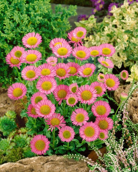 Der Feinstrahl bevorzugt durchlässige, eher magere bis mäßig nährstoffreiche Böden und verträgt Kalk; Staunässe sollte vermieden werden. Nach dem Anwachsen erweist sich die Gartenstaude als pflegeleicht und erstaunlich trockenheitsverträglich. Ein Rückschnitt nach der ersten Blühwelle fördert die Nachblüte, regelmäßiges Ausputzen verlängert die Blühdauer zusätzlich. Teilungen im Frühjahr oder Spätsommer halten den Gartenstrauch vital und blühfreudig. Robust, winterhart und vielseitig einsetzbar bringt Erigeron ‘Karminstrahl’ verlässlich Farbe und Struktur in jeden Garten.