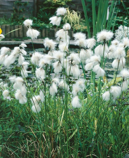 Eriophorum angustifolium, das Schmalblättrige Wollgras, ist eine elegante Sumpf- und Uferstaude mit besonderer Zierwirkung, die als Ziergras in Wassergärten, am Teichrand und im Moorbeet begeistert. Aus schmalen, grasartigen, frischgrünen Blättern treiben im späten Frühjahr aufrechte Stiele mit zunächst unscheinbaren, bräunlichen Blütenständen hervor, die sich im Sommer zu charakteristischen, watteweißen Wolle-Büscheln verwandeln und dem Garten bis in den Herbst eine luftige, leichte Textur verleihen. Der horstbildende, teils ausläuferbildende Wuchs erreicht je nach Standort etwa 40 bis 70 cm Höhe und bringt natürliche Bewegung in Beete, Uferränder und feuchte Senken. Als Solitär setzt das Wollgras wirkungsvolle Akzente, in Gruppenpflanzungen entsteht eine ruhige, naturnahe Atmosphäre; ebenso eignet es sich als Kübelpflanze in wasserdichten Gefäßen oder Schalen, sofern der Wurzelbereich dauerhaft feucht bis nass bleibt. Bevorzugt wird ein sonniger bis halbschattiger Standort mit humosem, torfigem, eher saurem und kalkarmem Substrat; Staunässe ist hier ausdrücklich erwünscht, auch ein flacher Wasserstand am Teichufer wird gut vertragen. Pflegeleicht und robust, genügt ein Rückschnitt der vertrockneten Halme und Fruchtstände im Spätwinter, um Platz für den frischen Austrieb zu schaffen. In Kombination mit anderen Uferstauden wie Sumpf-Schwertlilie oder Seggen entfaltet dieser Blüten- und Gartenstrauch im weiteren Sinne seine ganze Wirkung und bringt strukturreiche, natürliche Eleganz in Beet, Vorgarten, Terrasse und Wassergarten.