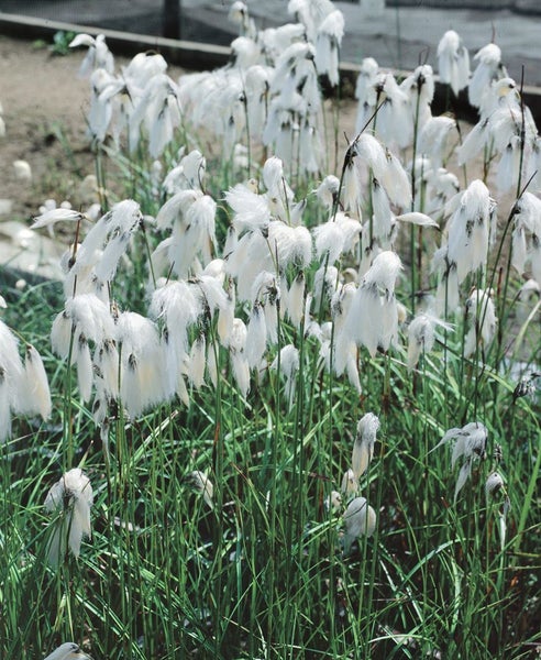 Eriophorum vaginatum, das Scheidige Wollgras, bringt mit seinen schneeweißen, watteartigen Samenständen eine unverwechselbare, natürliche Stimmung in den Garten. Dieses dekorative Ziergras aus der Familie der Sauergrasgewächse bildet dichte, langlebige Horste und zeigt schmale, grasartige, frischgrüne bis blaugrüne Blätter, die der Pflanze eine feine Struktur verleihen. Im Frühjahr bis Frühsommer erscheinen die unscheinbaren Blüten, kurz darauf entwickeln sich die charakteristischen, bauschigen Wollbüschel, die bis in den Herbst hinein zierend bleiben und selbst im Winter einen reizvollen Blickfang schaffen. Mit einer Wuchshöhe von etwa 40 bis 60 cm eignet sich das robuste Gras hervorragend für naturnahe Pflanzungen, den Uferbereich am Teich, das Moorbeet und feuchte Staudenbeete. Als Sumpfstaude und Teichrandpflanze kommt es sowohl in kleiner Gruppe als auch als Solitär gut zur Geltung; in großzügigen Kübeln lässt es sich auf Terrasse oder Balkon kultivieren, sofern dauerhaft ausreichend Feuchtigkeit zur Verfügung steht. Bevorzugt wird ein vollsonniger bis halbschattiger Standort mit humosem, saurem, torfigem bis moorbeetähnlichem Boden, der gleichmäßig feucht bis nass ist und zeitweilig flach überstaut sein darf. Eine lockere, luftige Substratstruktur und konstant feuchte Bedingungen fördern den kompakten, aufrechten Habitus. Pflegeleicht und zuverlässig, überzeugt dieses Garten- und Ziergras als stimmige Begleitpflanze zu anderen Sumpfstauden wie Iris, Carex oder Lysimachia und setzt in modernen wie natürlichen Pflanzkonzepten elegante, edle Akzente.