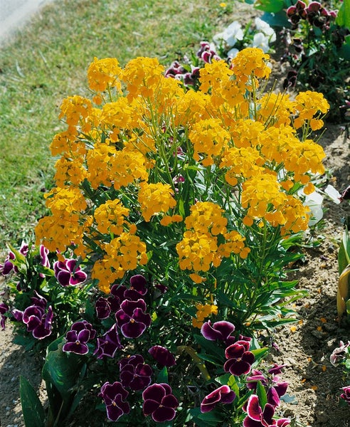 Erysimum x allionii, auf Deutsch häufig als Goldlack-Hybride oder Duft-Goldlack bezeichnet, bringt mit seinen leuchtend orange- bis apricotfarbenen Blüten frühlingshaften Glanz in den Garten. Die reich besetzten, traubigen Blütenstände erscheinen meist ab April und halten bei regelmäßigem Ausputzen bis in den Sommer, mit williger Nachblüte bis in den Herbst. Das schmale, lanzettliche, graugrüne Laub bleibt oft halbimmergrün und unterstreicht den kompakten, buschigen Wuchs dieser Blütenstaude mit halbstrauchigem Charakter, die je nach Standort etwa 30 bis 40 cm hoch und ähnlich breit wird. Als vielseitige Gartenstaude eignet sich Erysimum x allionii hervorragend für Steingarten, Bauerngarten und Staudenbeet, als Randbepflanzung im Vorgarten, für Natursteinmauern und sonnige Böschungen sowie als Kübelpflanze auf Terrasse und Balkon; sie wirkt sowohl in Gruppenpflanzung als auch als kleiner Solitär. Ideal ist ein vollsonniger, warmer, geschützter Platz mit durchlässigem, sandig-kiesigem bis magerem Substrat; kalkverträgliche, eher trockene Bedingungen werden gut toleriert, Staunässe sollte vermieden werden. Pflegeleicht in der Haltung genügen maßvolles Gießen und ein Rückschnitt um etwa ein Drittel nach der Hauptblüte, der die Vitalität fördert und eine zweite Blütenwelle anregt. In rauen Lagen empfiehlt sich ein leichter Winterschutz bei Kahlfrost. Da die Pflanze kurzlebig sein kann, lohnt gelegentliches Verjüngen durch Stecklinge oder Selbstaussaat. Besonders harmonisch wirkt Erysimum x allionii in Kombination mit Tulpen, Narzissen, Katzenminze, Lavendel, graulaubigen Stauden und feinen Ziergräsern.