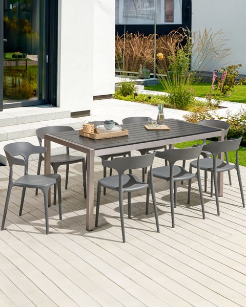 Modernes, graues Kunststoffstuhl Set für den Innen- und Außenbereich. Suchen Sie nach vielseitigen Stühlen? Dieses Modell ist dank seiner Fertigung aus hochqualitativem Kunststoff sowohl pflegeleicht als auch langlebig. Dabei sind die Kunsstoffstühle ein Leichtgewicht, so werden Sie in der Lage sein sie schnell vom Balkon in den Wohnraum zu befördern, um ihre Vorteile auch im Innenbereich genießen zu können. Für den entsprechenden Komfort sorgen die breiten Sitzflächen und die hohen, runden Rückenlehnen. Damit man das Set leichter verstauen kann, lässt es sich auch praktisch stapeln. Details: Typ Esszimmerstuhl. Farbe: Grau. Material: Kunststoff. Material: Polypropylen. Gestellmaterial: Kunststoff. Sitzmaterial: Kunststoff. Zusammenstellung: 100% Polypropylen. Armlehnen: Nein. Finish: Matt. Zusammenklappbar: Nein. Stapelbar: Ja. Abmessungen: Tiefe: 49 cm. Sitzhöhe: 42 cm. Breite: 50 cm. Höhe: 76 cm. Sitzfläche: 41x42 cm. Gewicht: 4 kg. Max. Belastung: 150 kg. .Sie kaufen: 8 x Stühle. Produktvorteile: Feste und komfortable Sitzfläche, Passt ausgezeichnet zu vielen Einrichtungsstilen, Modernes Design, Geeignet für den Innen- und Aussenbereich, Platzsparend stapelbar. Montage: Benötigt keine Montage. Beständigkeit: Wasserbeständig, UV-beständig. Beständigkeit Text: Feuchtigkeitsbeständigkeit bedeutet, dass der Artikel leichtem Regenschauer und hoher Luftfeuchtigkeit im Außenbereich standhält. Sollte es nicht möglich sein, ihn drinnen zu lagern, sollte er mit einem Regenschutz abgedeckt werden. Wenn Möbel oder Accessoires längere Zeit Feuchtigkeit ausgesetzt werden, kann dies zu anhaltenden Schäden führen. Der Artikel ist aus UV-beständigen Materialien hergestellt, so dass er im Freien verwendet werden kann, ohne dass die Farbe verblasst. Pflegeanleitung: Polypropylen: 1.Die Reinigung kann mit handelsüblicher milder Seifenlauge und einem weichen Tuch erfolgen. 2.Die Verwendung eines Grills in der Nähe des Möbelstücks sollte mit grösster Vorsicht geschehen, da Funken der Holzkohle stellenweise Beschädigungen verursachen können. Legen Sie aus diesem Grund auch keine heissen Grillzangen und Spiesse auf die Tischplatte. 3.Das Material ist extrem witterungbeständig. Jedoch empfehlen wir für die Wintersaison eine Schutzhülle zu verwenden oder, wenn möglich, die Möbel trocken und kühl drinnen zu lagern.