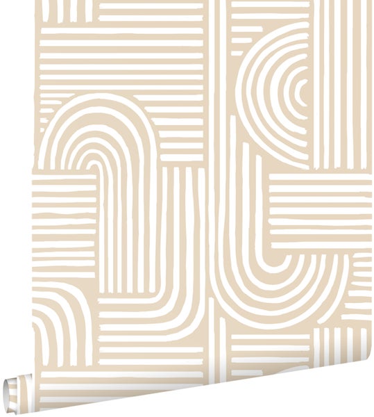 Diese Tapete mit 3D-Muster in Sandbeige macht jede Wand zu einem wahren Hingucker und passt perfekt in einen modernen Einrichtungsstil.