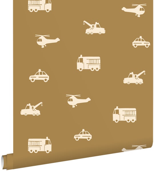 ESTAhome Tapete Autos, Löschfahrzeuge, Hubschrauber und Kräne Ockergelb 50 x 900 cm