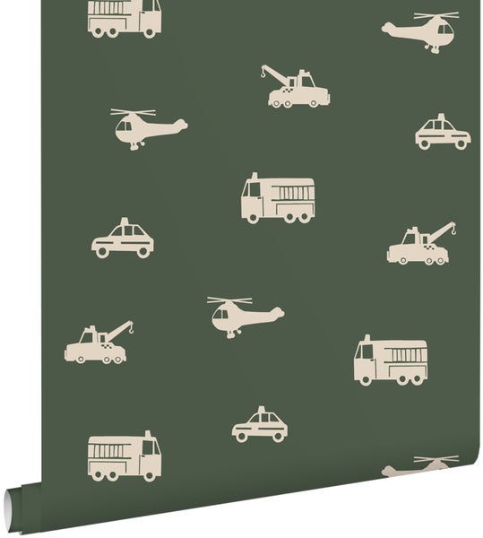 ESTAhome Tapete Autos, Löschfahrzeuge, Hubschrauber und Kräne Olivgrün 50 x 900 cm