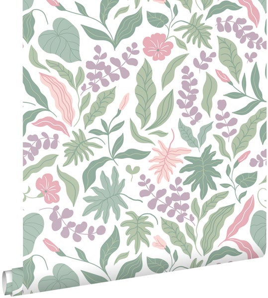 Diese trendige und farbenfrohe Tapete mit Blätter und Blumen in Lila, Rosa und Grün macht jede Wand zu einem echten Hingucker und sorgt das ganze Jahr über für eine sommerliche, tropische Atmosphäre.