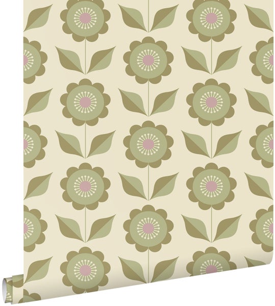 Diese Tapete mit Blumen in Graugrün verleiht jedem Wohnraum den angesagten Retro-Look und lässt sich perfekt mit schönen Retro-Design Möbeln und Accessoires in bunten Farben kombinieren. Auch Zimmerpflanzen wie Sansevieria, Philodendron, Kakteen oder Hängepflanzen passen perfekt dazu und runden den Look ab.