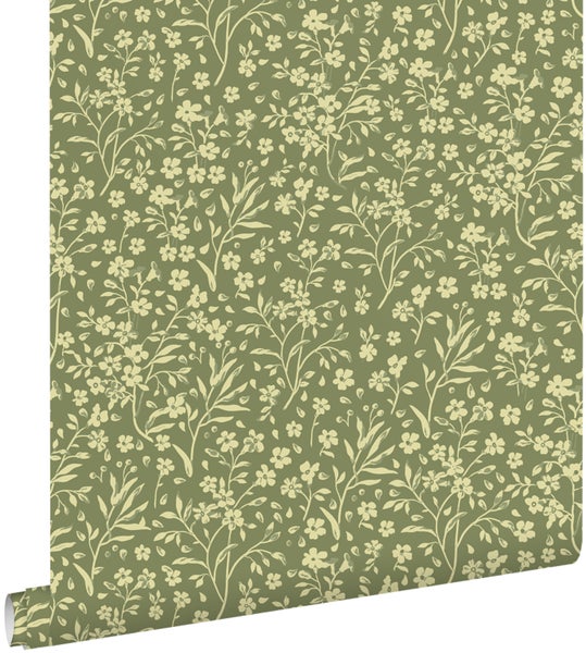 Diese schöne Tapete mit Blumen in Grün verleiht jedem Wohnraum einen warmen Vintage-Look. Sie versprüht einen Hauch Nostalgie und lässt an vergangene Zeiten erinnern. Stilvolle Vintage Accessoires und Möbel passen perfekt zu dieser Tapete und runden den Look ab.