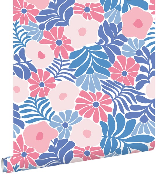 Diese lebendige Tapete mit Blumen im Matisse-Stil in Blau und Rosa ist die perfekte Möglichkeit, einer Einrichtung einen verspielten und fröhlichen Touch zu verleihen.