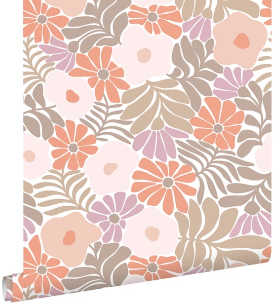 Diese lebendige Tapete mit Blumen im Matisse-Stil in Orange, Lila und Hellrosa ist die perfekte Möglichkeit, einer Einrichtung einen verspielten und fröhlichen Touch zu verleihen.