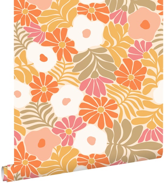 Diese lebendige Tapete mit Blumen im Matisse-Stil in Orange und Gelb ist die perfekte Möglichkeit, einer Einrichtung einen verspielten und fröhlichen Touch zu verleihen.