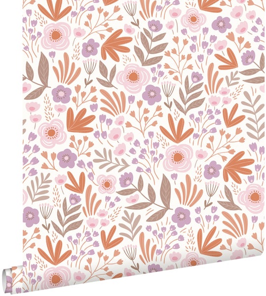 Diese trendige und fröhliche Tapete mit Blumen in Orange und Lila lässt jede Wand strahlen! Die Tapete kann mit vielen Farben kombiniert werden und das macht diese Tapete zu einem absoluten Must-Have.