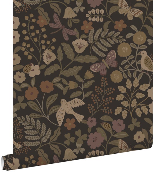 ESTAhome Tapete Blumen und Vögel Dunkelbraun, Olivgrün und Violett 53 cm x 10.05 m