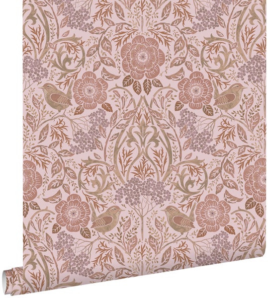 Diese schöne Tapete mit Blumen und Vögeln in Violett und Terrakottarosa verleiht jedem Wohnraum einen warmen Vintage-Look. Sie versprüht einen Hauch Nostalgie und lässt an vergangene Zeiten erinnern. Stilvolle Vintage Accessoires und Möbel passen perfekt zu dieser Tapete und runden den Look ab.