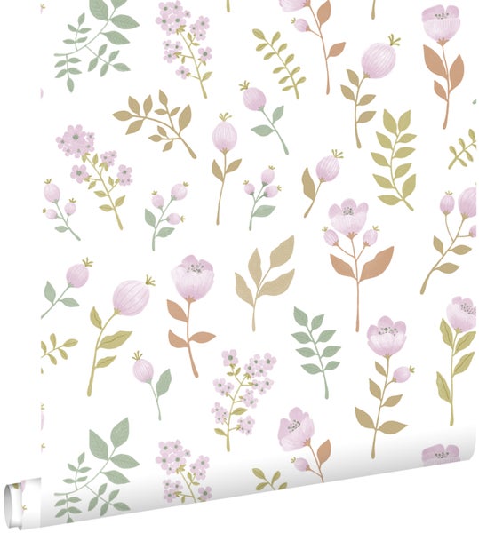 Diese fröhliche Tapete mit Blumen in Violett und Graugrün lässt jedes Mädchenherz höher schlagen. Kombiniert mit hellen Farben und natürlichen Materialien, entsteht eine angenehme Atmosphäre, die zum Spielen, Lachen, Lesen und Träumen einlädt.