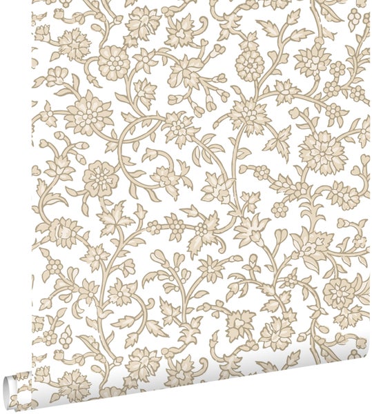 Diese schöne Tapete mit Blumenmuster in Beige verleiht jedem Wohnraum einen warmen Vintage-Look. Sie versprüht einen Hauch Nostalgie und lässt an vergangene Zeiten erinnern. Stilvolle Vintage Accessoires und Möbel passen perfekt zu dieser Tapete und runden den Look ab.