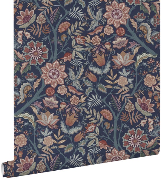 ESTAhome Tapete Blumenmuster Dunkelblau und Terrakottabraun 53 cm x 10.05 m