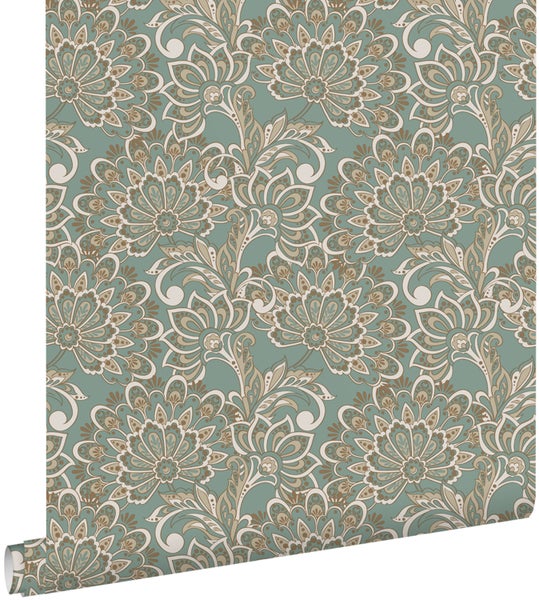 Diese schöne Tapete mit Blumenmuster in Graugrün verleiht jedem Wohnraum einen warmen Vintage-Look. Sie versprüht einen Hauch Nostalgie und lässt an vergangene Zeiten erinnern. Stilvolle Vintage Accessoires und Möbel passen perfekt zu dieser Tapete und runden den Look ab.