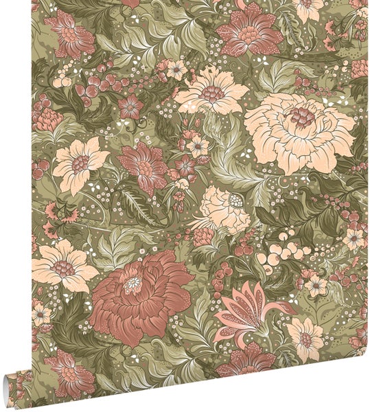 Diese schöne Tapete mit Blumenmuster in Grün und Altrosa verleiht jedem Wohnraum einen warmen Vintage-Look. Sie versprüht einen Hauch Nostalgie und lässt an vergangene Zeiten erinnern. Stilvolle Vintage Accessoires und Möbel passen perfekt zu dieser Tapete und runden den Look ab.