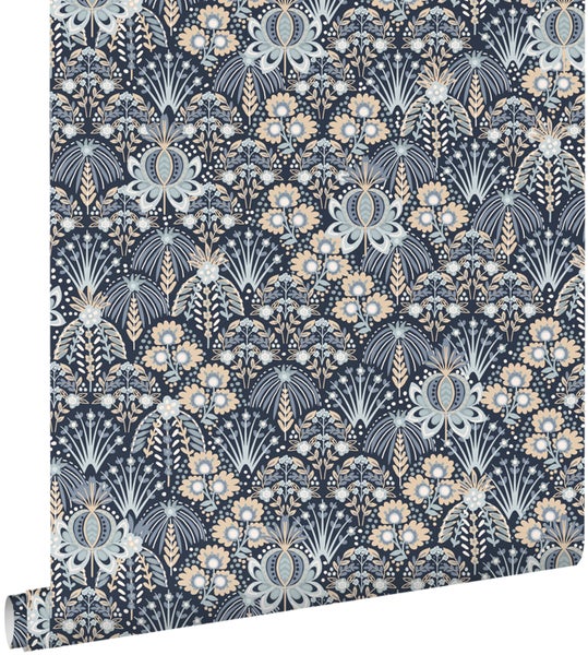 Diese schöne Tapete mit Blumenmuster im Jugendstil in Blau verleiht jedem Wohnraum einen warmen Vintage-Look. Sie versprüht einen Hauch Nostalgie und lässt an vergangene Zeiten erinnern. Stilvolle Vintage Accessoires und Möbel passen perfekt zu dieser Tapete und runden den Look ab.