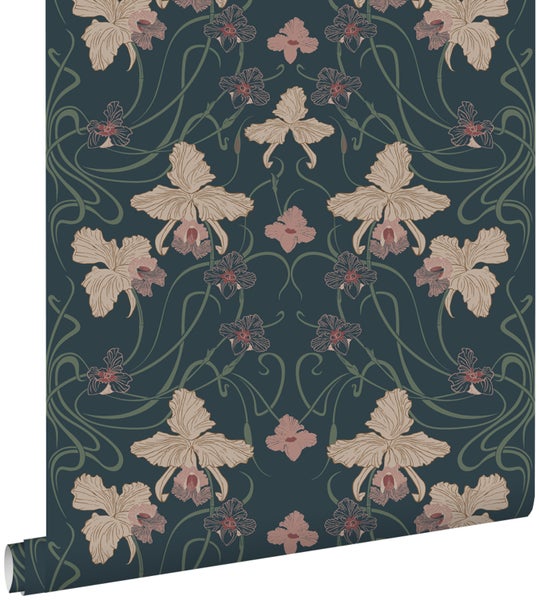 Diese schöne Tapete mit Blumenmuster im Jugendstil in Dunkelblau, Beige und Graugrün verleiht jedem Wohnraum einen warmen Vintage-Look. Sie versprüht einen Hauch Nostalgie und lässt an vergangene Zeiten erinnern. Stilvolle Vintage Accessoires und Möbel passen perfekt zu dieser Tapete und runden den Look ab.