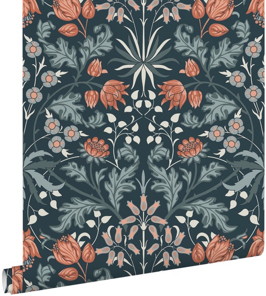 Diese schöne Tapete mit Blumenmuster im Jugendstil in Dunkelblau und Terrakotta verleiht jedem Wohnraum einen warmen Vintage-Look. Sie versprüht einen Hauch Nostalgie und lässt an vergangene Zeiten erinnern. Stilvolle Vintage Accessoires und Möbel passen perfekt zu dieser Tapete und runden den Look ab.