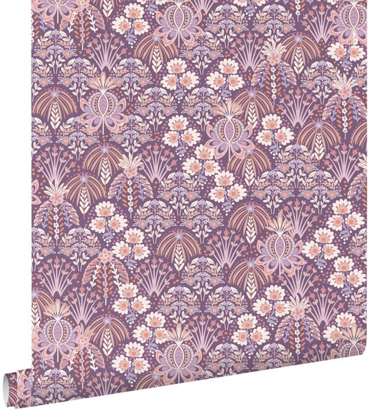 Diese schöne Tapete mit Blumenmuster im Jugendstil in Lila verleiht jedem Wohnraum einen warmen Vintage-Look. Sie versprüht einen Hauch Nostalgie und lässt an vergangene Zeiten erinnern. Stilvolle Vintage Accessoires und Möbel passen perfekt zu dieser Tapete und runden den Look ab.