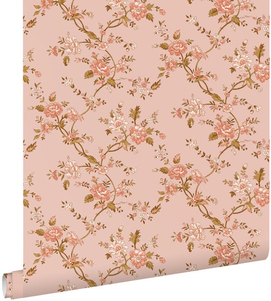 Diese schöne Tapete mit Blumenmuster in Terrakottarosa sorgt in jedem Wohnraum für eine warme, romantische Atmosphäre. Sie versprüht sogar einen Hauch Nostalgie und lässt an vergangene Zeiten erinnern.