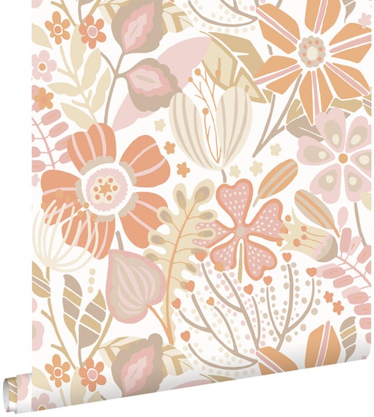 Diese trendige und fröhliche Tapete mit Blumenmuster in Violettrosa, Terrakotta und Beige lässt jede Wand strahlen! Die Tapete kann mit vielen Farben kombiniert werden und das macht diese Tapete zu einem absoluten Must-Have.