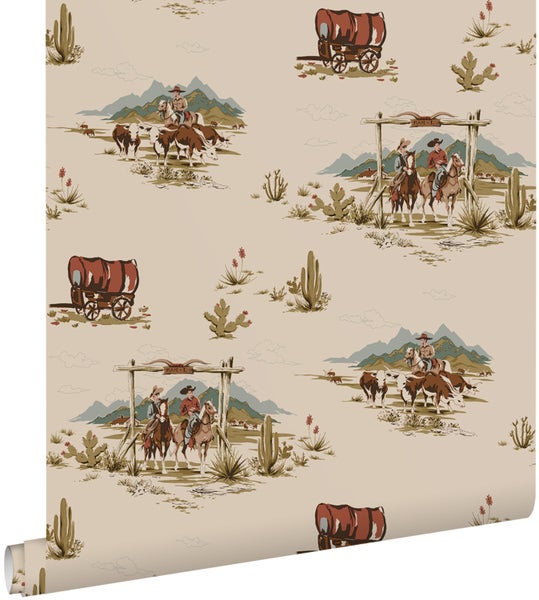 ESTAhome Tapete Cowboys Beigebraun, Blau und Grün 50 x 900 cm