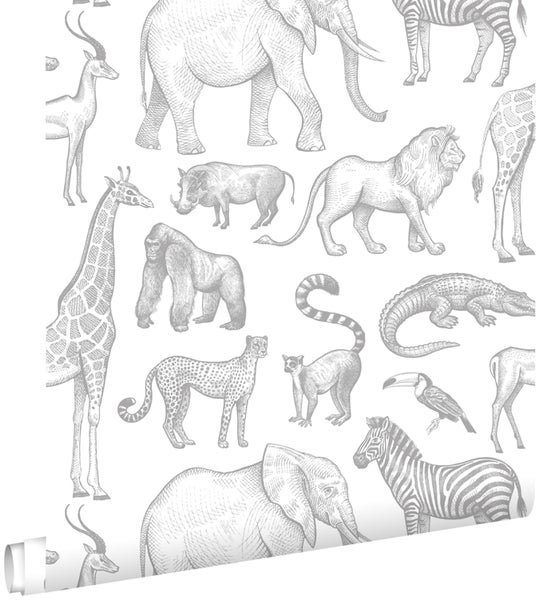 ESTAhome Tapete Dschungeltiere Weiß und Grau 53 cm x 10.05 m