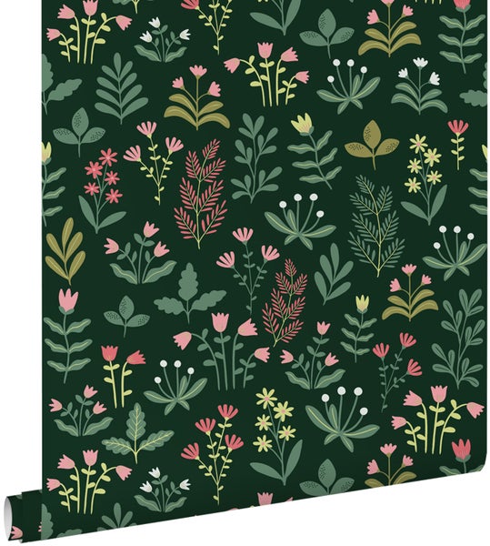 Diese trendige und fröhliche Tapete mit Feldblumen in Dunkelgrün und Rosa lässt jede Wand strahlen! Die Tapete kann mit vielen Farben kombiniert werden und das macht diese Tapete zu einem absoluten Must-Have.