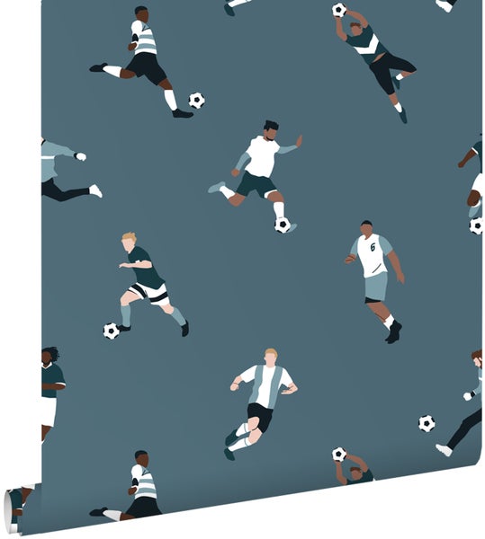Diese Tapete mit Fußballspielern in Dunkelblau verleiht jedem Wohnraum einen sportlichen Look mit einem Vintage-Touch. Diese Tapete bietet außerdem viele Kombinationsmöglichkeiten. So kann diese Tapete zum Beispiel sowohl perfekt mit dunklen, warmen Tönen als auch mit hellen Farben und Hölzern kombiniert werden.