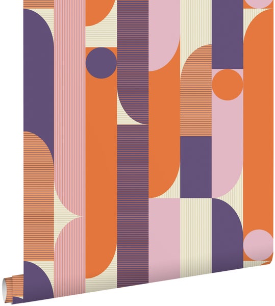 Diese trendige Tapete mit geometrischen Formen in Lila, Orange und Braun macht jede Wand zu einem echten Hingucker und passt perfekt in einen modernen Einrichtungsstil. Diese Tapete kann sowohl stilvoll mit dunklen, warmen Tönen als auch mit hellen Farben und Hölzern kombiniert werden. Gerade diese Kombinationen sorgen für ein harmonisches Gesamtbild.