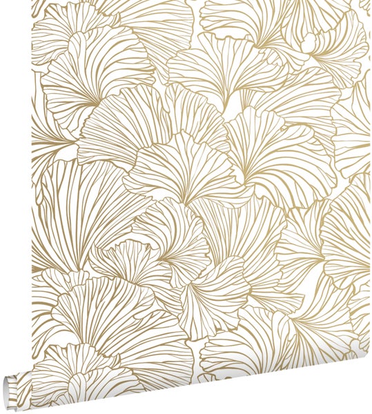 ESTAhome Tapete Ginkgoblätter Weiß und Gold 53 cm x 10.05 m