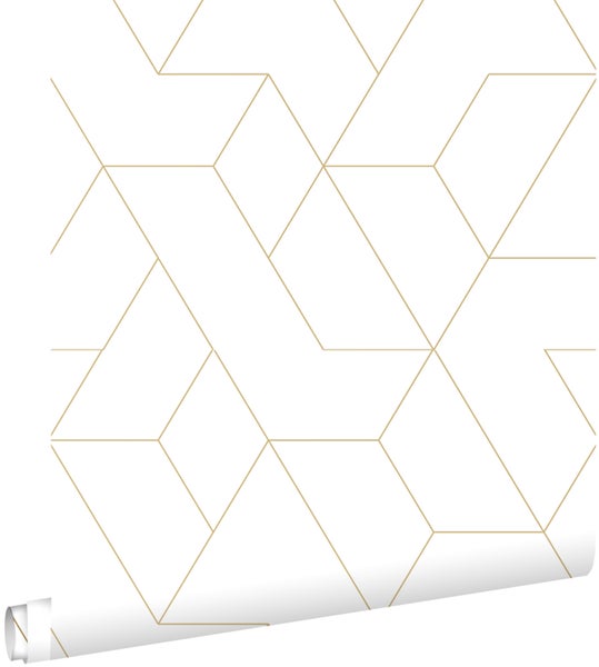 Diese schöne Tapete mit grafischen Linien in Weiß und Gold macht jede Wand zu einem stilvollen Eyecatcher. Sie passt perfekt in einen modernen Einrichtungsstil und schafft eine warme, stimmungsvolle Atmosphäre