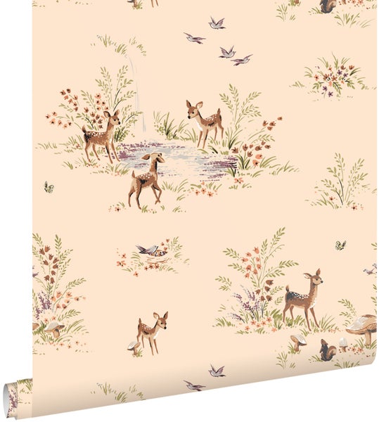 Diese Tapete mit Hirschen in Beige verwandelt das Kinderzimmer in ein magisches Abenteuerland. Das fröhliche Motiv schafft eine gemütliche und einladende Atmosphäre, die zum Spielen, Träumen und Lachen einlädt.