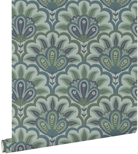 Diese trendige und farbenfrohe Tapete mit orientalisches Barockmotiv in Blau und Grün macht jede Wand zu einem echten Hingucker und sorgt das ganze Jahr über für eine sommerliche, tropische Atmosphäre.