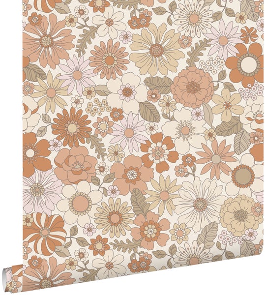 Diese schöne Tapete mit Retro Blumen in Terrakotta und Hellbeige verleiht jedem Wohnraum einen warmen Vintage-Look. Sie versprüht einen Hauch Nostalgie und lässt an vergangene Zeiten erinnern. Stilvolle Vintage Accessoires und Möbel passen perfekt zu dieser Tapete und runden den Look ab.